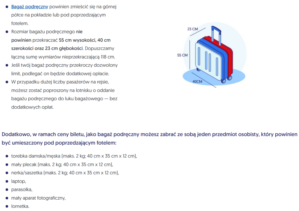 (limit bagażu – 1 szt – bagaż osobisty + 1 szt bagaż podręczny)